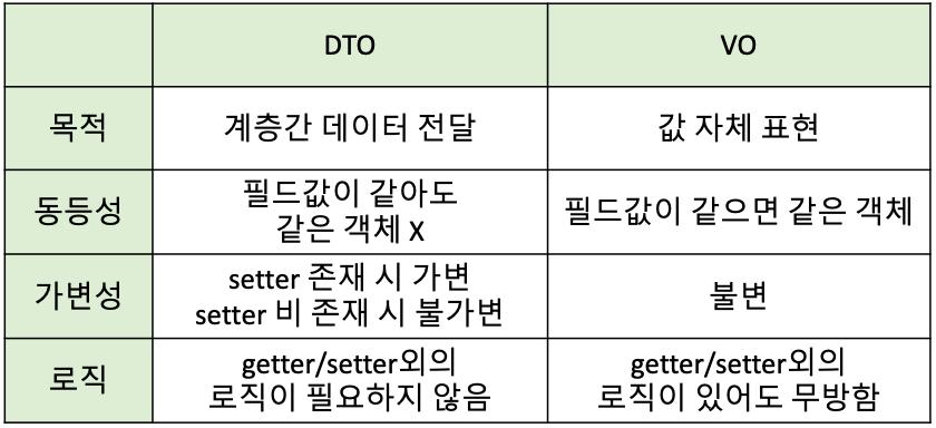 DTO와 VO의 차이점을 정리해보면 아래와 같다.